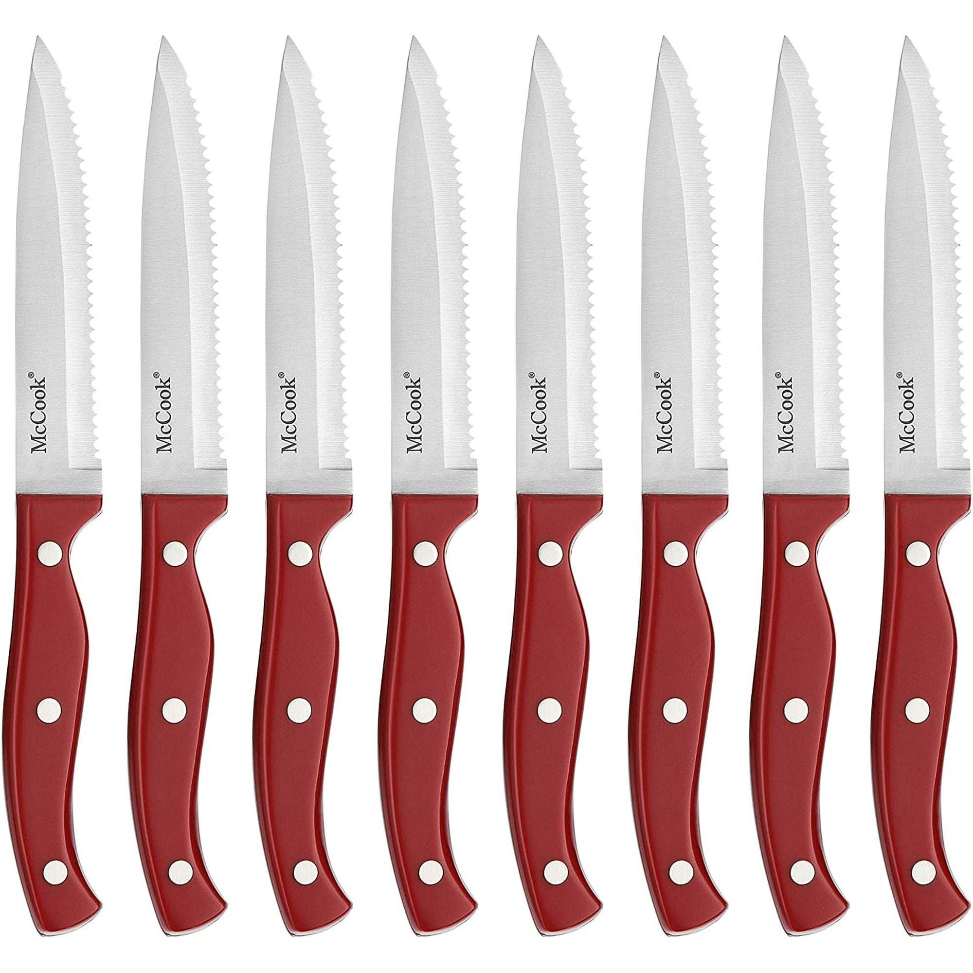 8pcs Steak Knives,McCook MC56 Serrated Steak Knife Set Red Full Tang Stainless Steel Table Knives Set