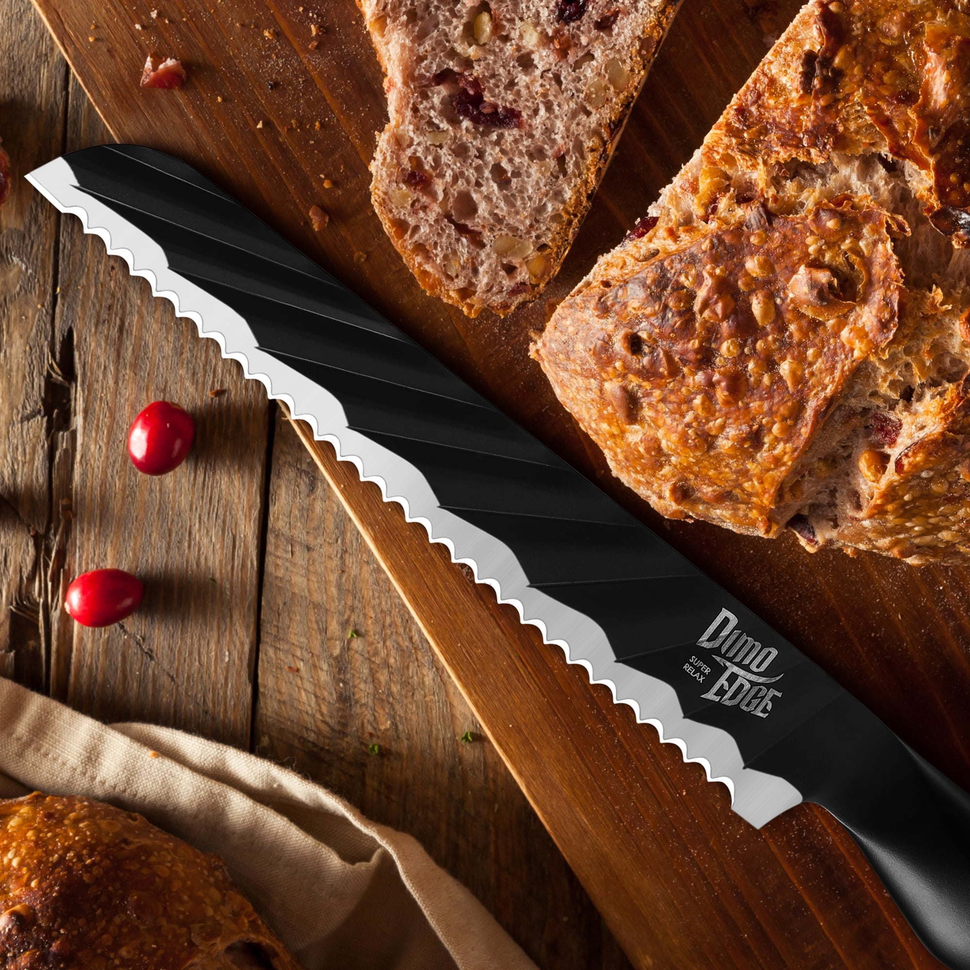 Premium Material and Ultra-sharp Edge: This set of knives is made of high-quality stainless steel 2CR13N, which has very high corrosion resistance and excellent durability. After nitriding treatment, the blades are not only super sharp, but also have good rust resistance. The black oxidized blade makes it non-stick and rust-proof. The brushed finish on the blade gives it a sharp, sleek look, and the blade is hand-ground by craftsmen into a V-shape that tapers down to an extremely sharp edge. The blade is forged into a special wavy shape and has a physical non-stick effect.