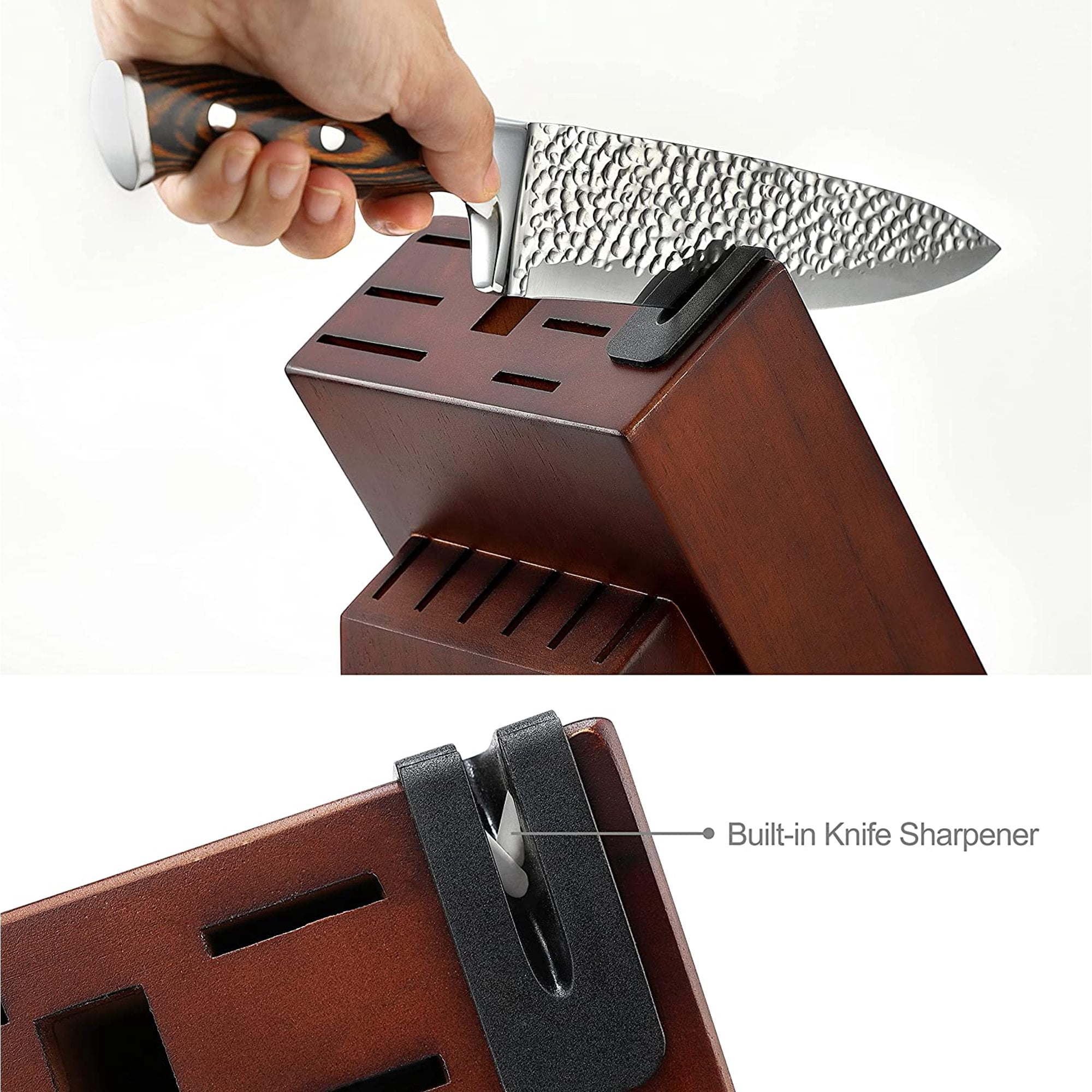 The smartly designed knife block, with built-in sharpener for easy and convenient sharpening for fine/straight edge blades, you can sharpen blades any time, so as to meet your daily food preparation needs, no need to worry about the blade becomes blunt.
