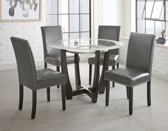 Set includes 45-inch Round Glass Top Dining Table & 4 Grey Side Chairs
