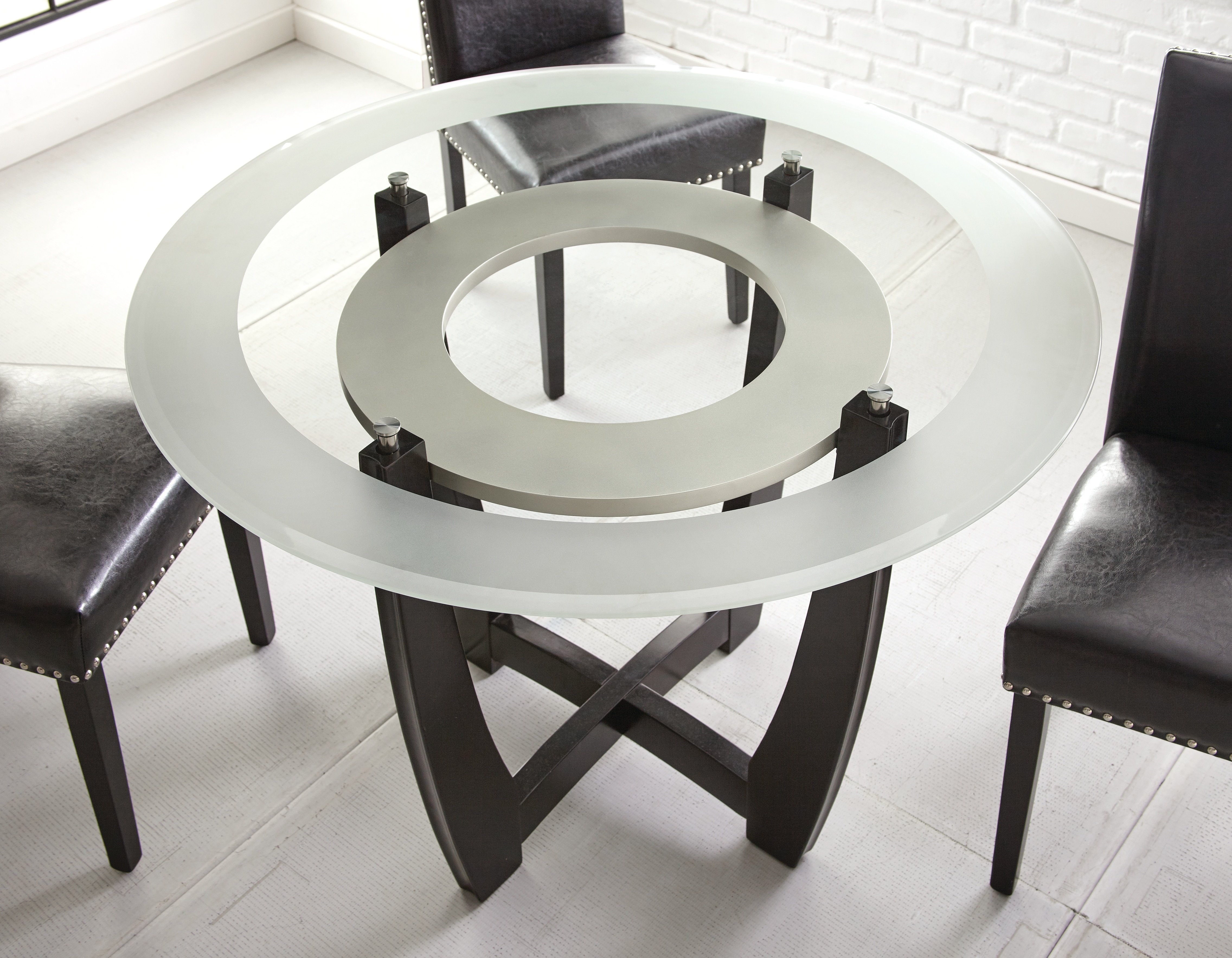 Contemporary small area dining set constructed of tempered glass, rubberwood solids, and black polyurethane chairs